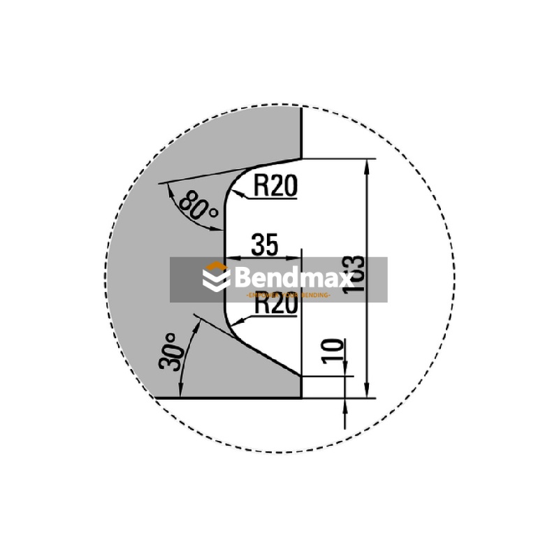 Matriz de plegadora de gran apertura V80 Es una matriz en V simple de alta resistencia diseñada para sistemas de plegado Wila/Trumpf. Con una enorme abertura en V de 80 mm y un ángulo de 80° de gran durabilidad, está diseñada para el plegado de chapas gruesas. Su radio de hombro R8,0 mm evita el agrietamiento del material y los daños en la superficie, lo que la convierte en la solución ideal para trabajos de estructuras de acero y fabricación pesada.